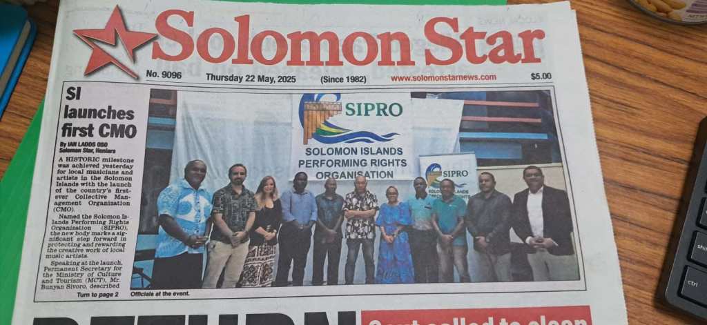 This week marks a historic milestone for the Pacific creative industry as the Solomon Islands officially launched their first Collective Management Organization (CMO), SIPRO (Solomon Islands Performing Rights Organisation). The Solomon Star newspaper featured this landmark event on its front page, highlighting the country’s commitment to protecting artists’ intellectual property rights.