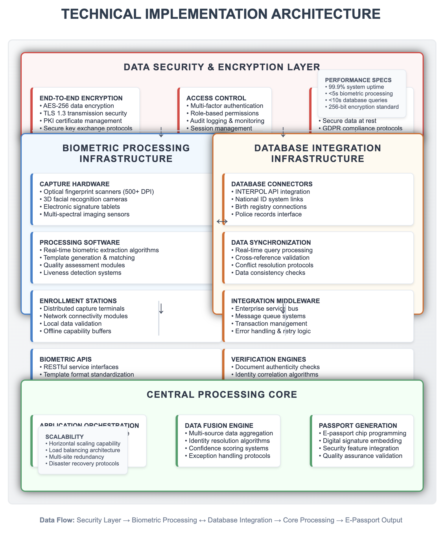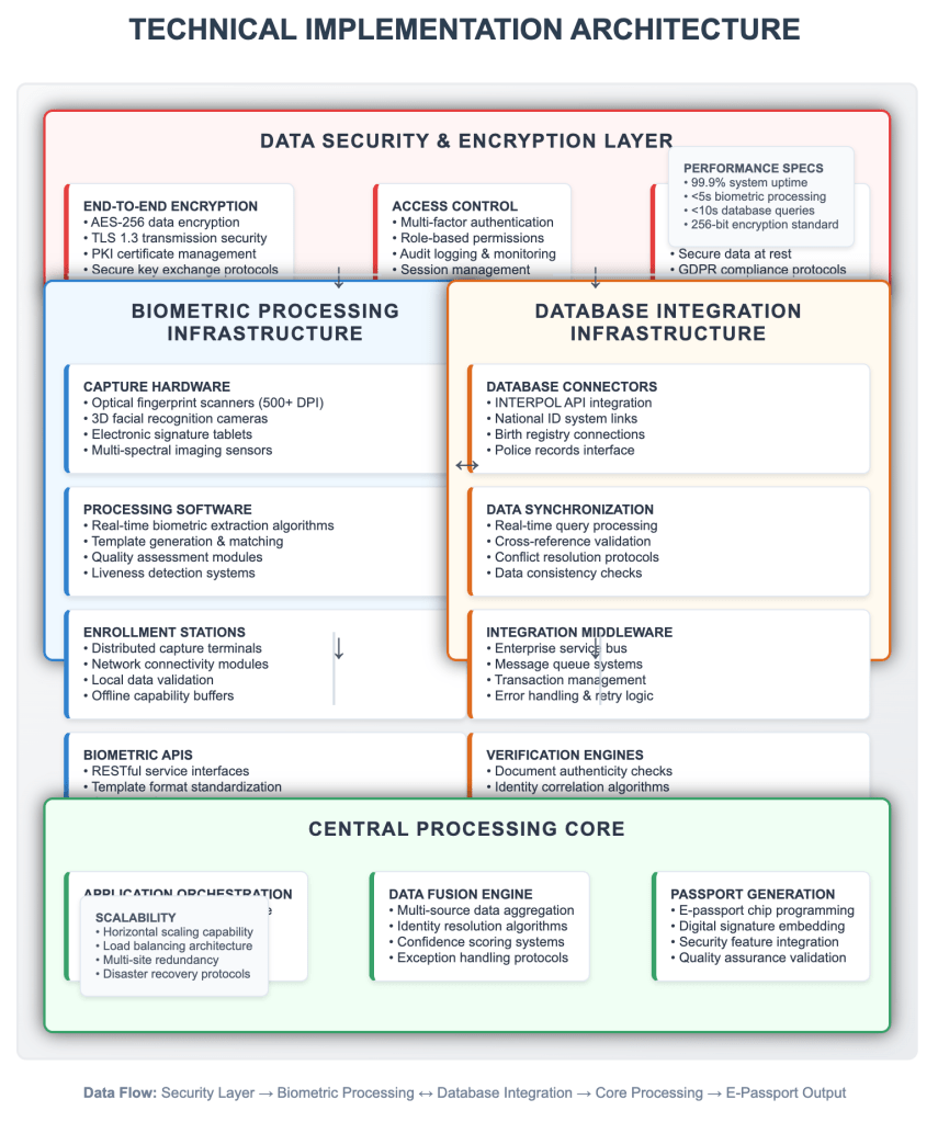 The e-passport system implementation appears to suggest, or we hope it involves, sophisticated backend integration—potentially interfacing with key government databases such as birth registries, national ID systems, police records, and financial intelligence units for verification purposes. It likely requires advanced biometric processing infrastructure to capture and manage fingerprints, facial features, and electronic signatures at enrollment points. Ideally, strong data security measures—including encryption and secure transmission protocols—are in place to safeguard the sensitive biometric and personal information being handled. The system architecture diagram was generated by AI to illustrate this assumed framework.