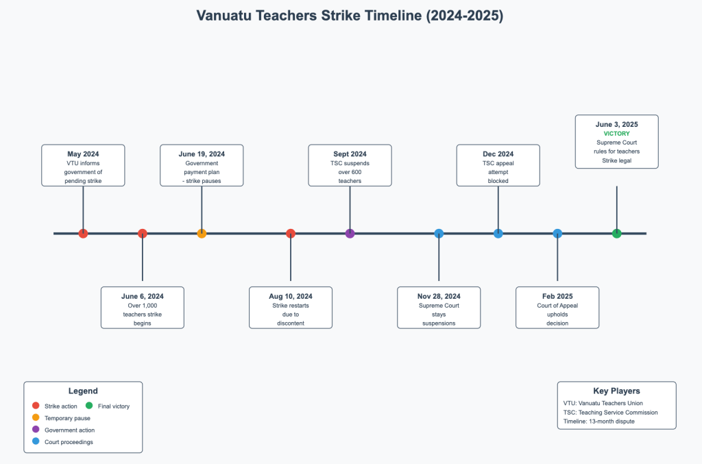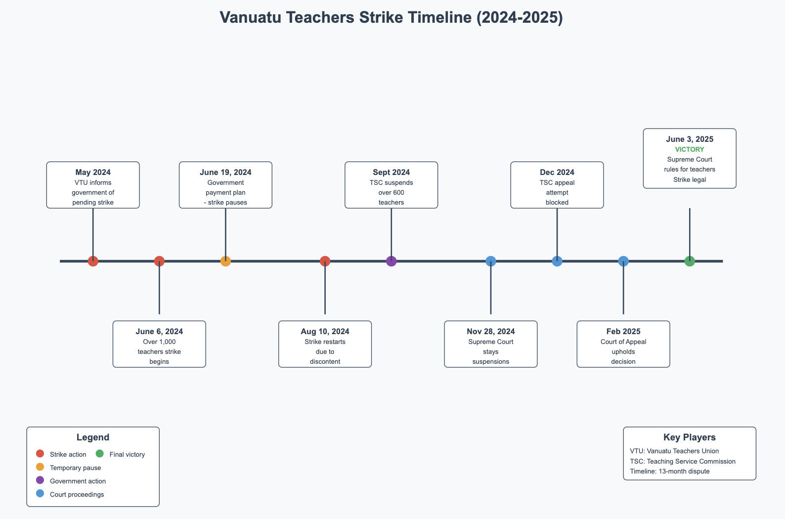 In May 2024, the Vanuatu Teachers Union officially informed the government of a pending strike due to unpaid entitlements. By June 6, over 1,000 teachers walked off the job. A short pause came on June 19 after the government offered a payment plan—but by August 10, discontentment led to the strike restarting.