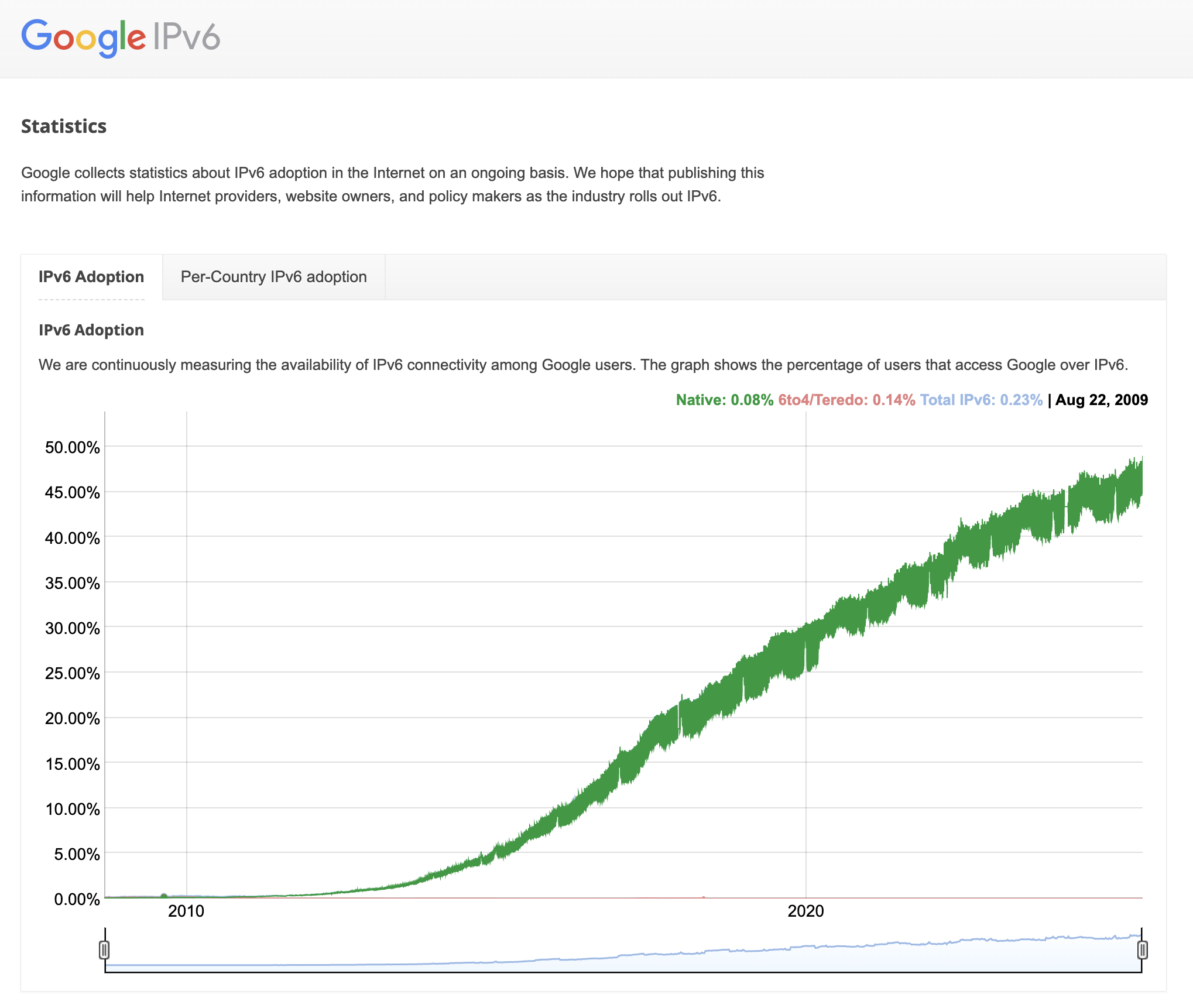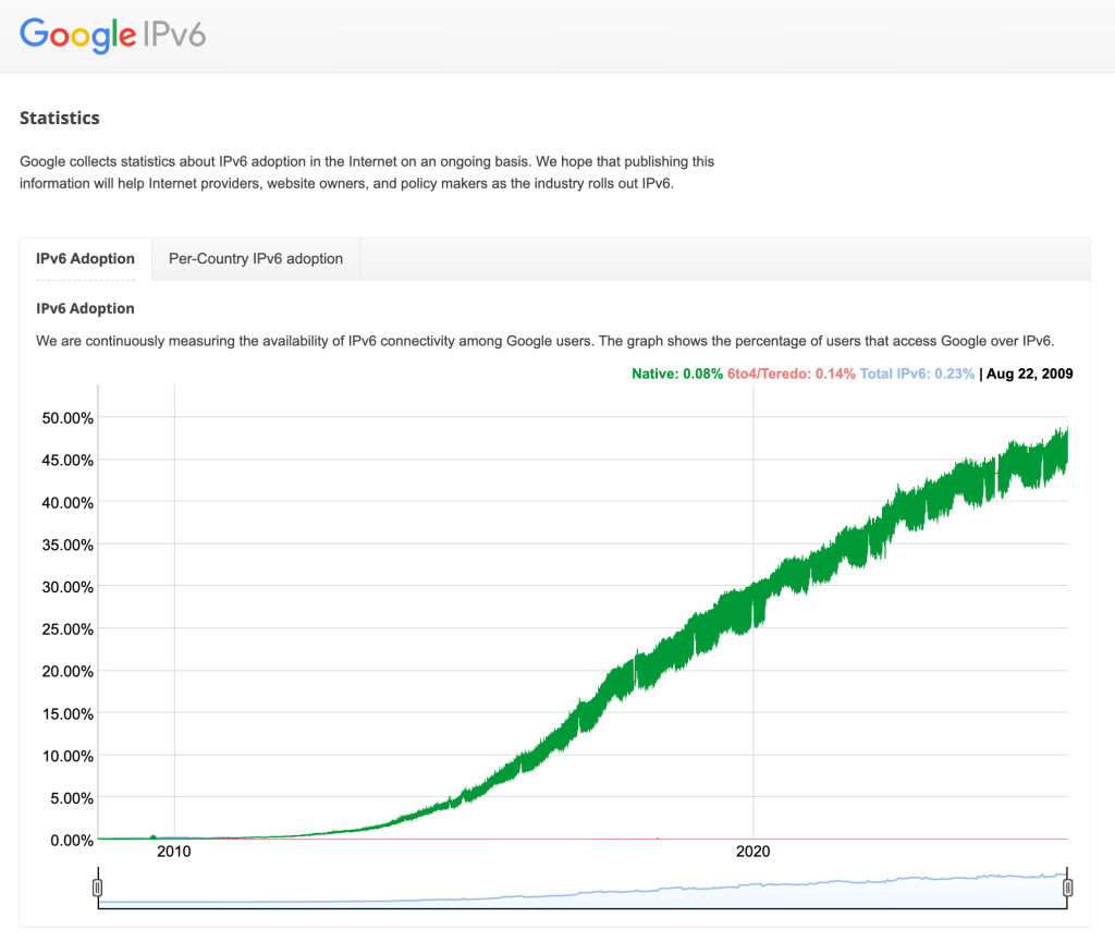 Asked Franck to clarify what “5 points of difference” meant in the original post. Franck replied that IPv6 traffic currently fluctuates between 43% and 48% according to Google’s public stats.