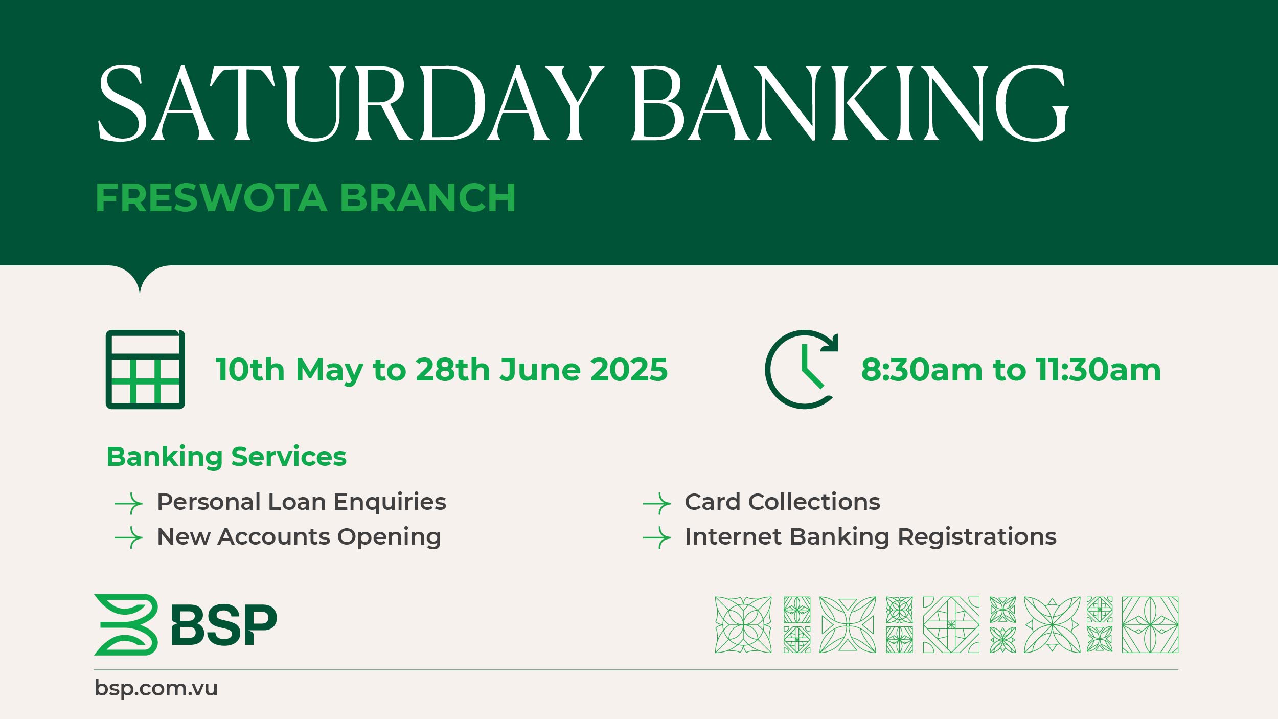 BSP Financial Group Limited (BSP) has announced that its Freswota Branch in Port Vila will now open on Saturdays, beginning 10th May and continuing through 28th June 2025. The move aims to provide greater convenience for customers who may not be able to access banking services during regular weekday hours.
