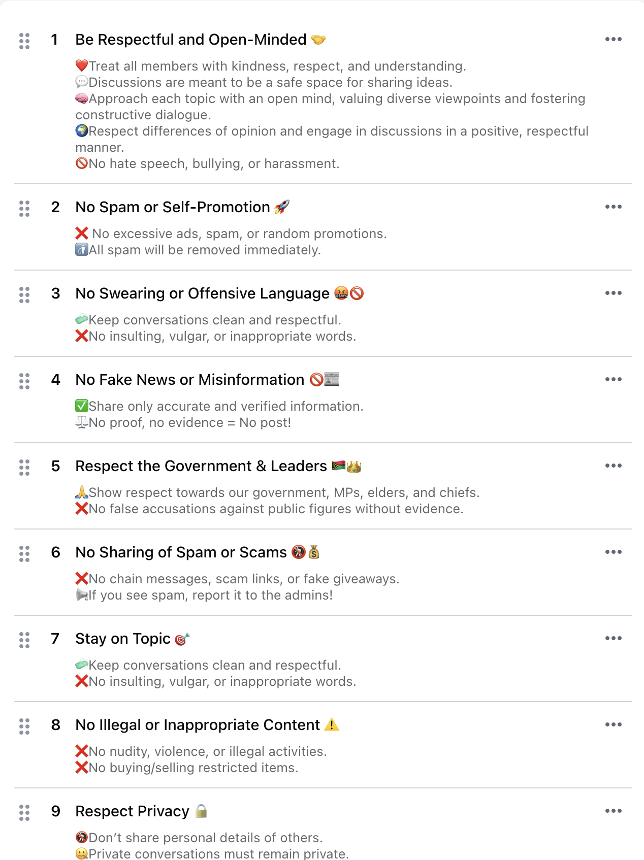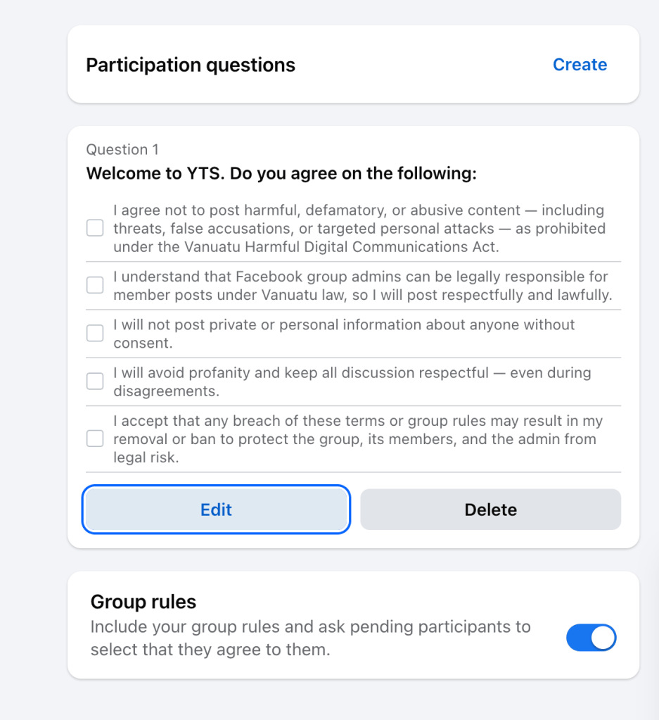 Under the Vanuatu Harmful Digital Communications Act, Facebook admins can be held legally responsible for harmful or defamatory content shared by group members. That means:
