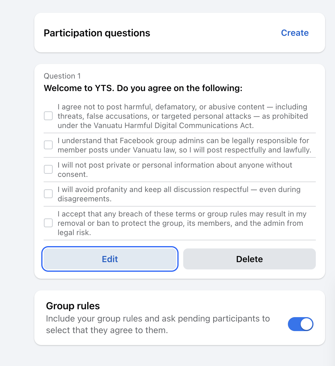 Go into your Facebook Group Settings and set your House Rules: